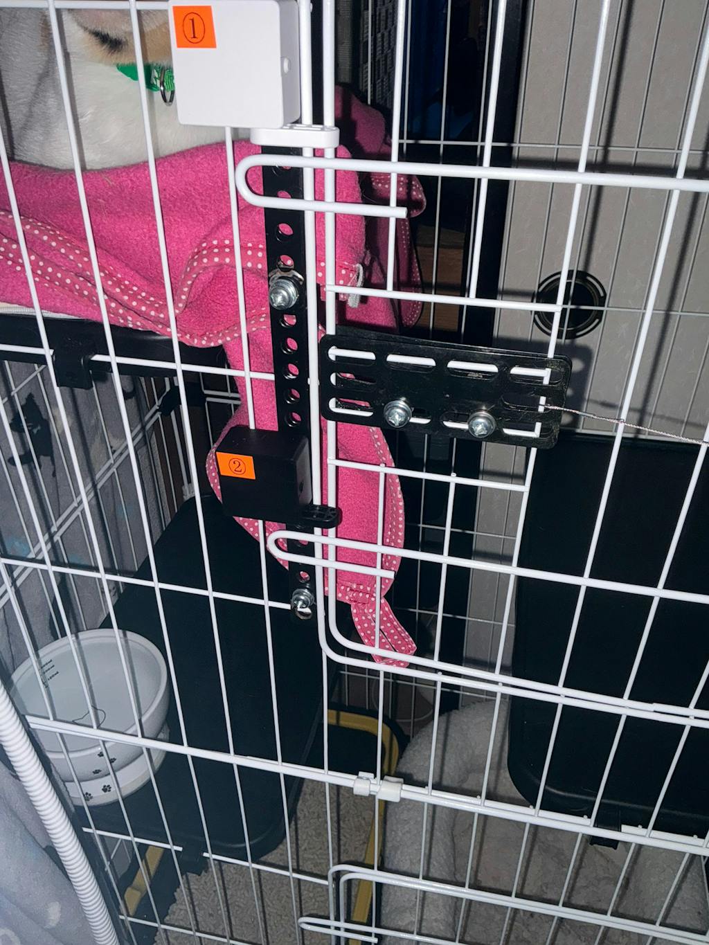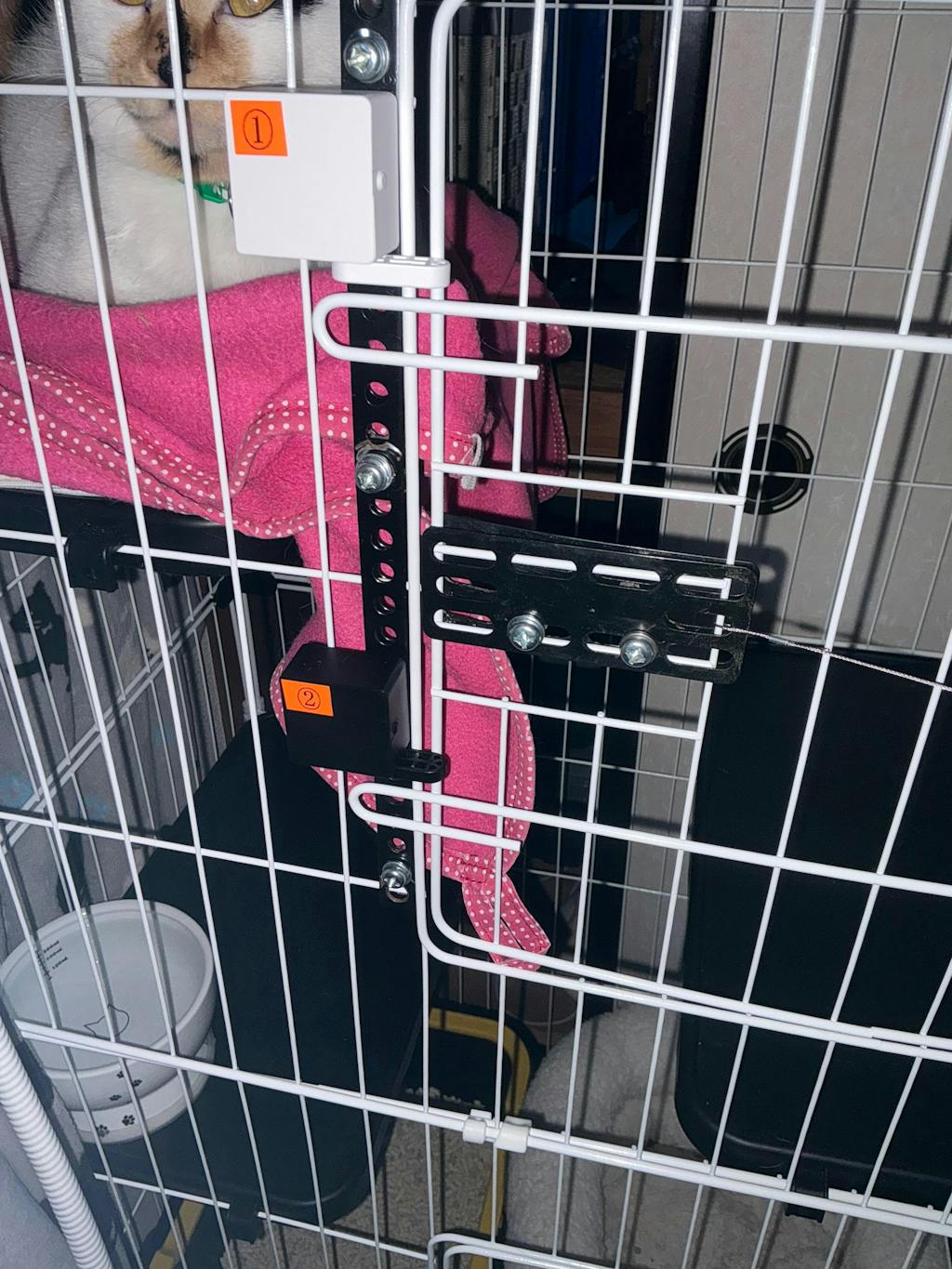 猫ケージの遠隔扉開閉用にボット2を2個、鍵として使用