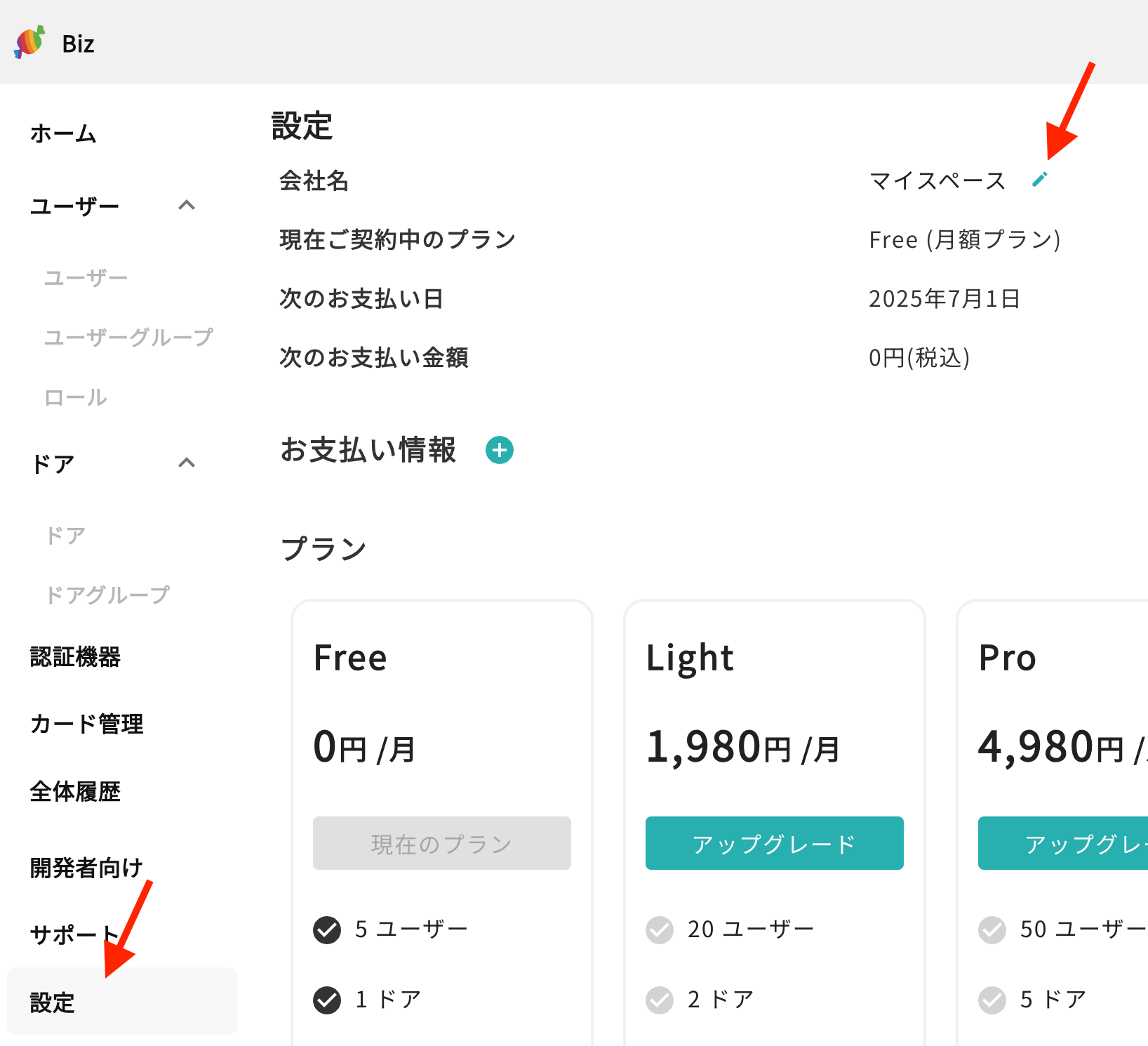 ログイン完了後、マイスペースというFreeプランの会社が自動で登録されますので、設定ページを開き、右側の編集アイコンをクリックし名前の編集を行ってください。