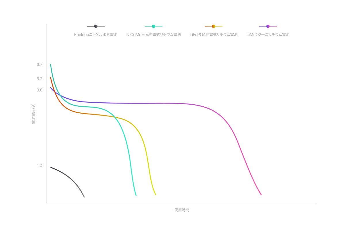 使用時の電圧降下が大きく(-15%)、一次リチウム電池ほど安定した電圧で製品の性能維持できません。