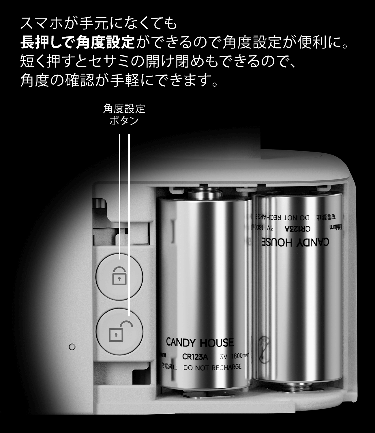 ・電池カバー内蔵ボタン:セサミアプリを開かなくても、長押しで、セサミの現在角度を、施錠角度と解錠角度に設定できますし、短く押すとセサミの開け閉めができます。